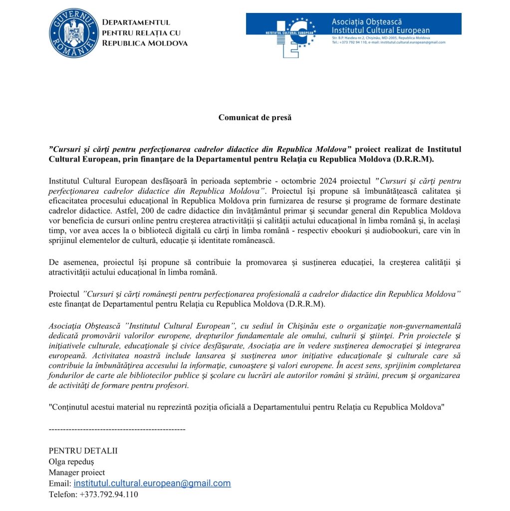 Comunicat de presa – Cursuri și cărți pentru perfecționarea cadrelor didactice din Republica Moldova Posted by Olga Categories Comunicate De Presa Date septembrie 20, 2024 Comments 0 comment Share: Olga Previous post Cursuri și cărți pentru perfecționarea cadrelor didactice din Republica Moldova septembrie 20, 2024